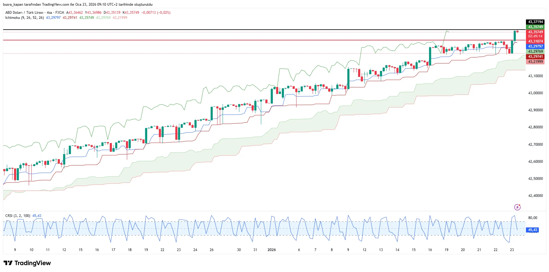 Kur, saat 10.11 itibarıyla 43,37 seviyesine ulaşarak yeni bir tarihi zirveye imza attı. Böylece dolar, haftanın son işlem gününde de yukarı yönlü seyrini sürdürmüş oldu.